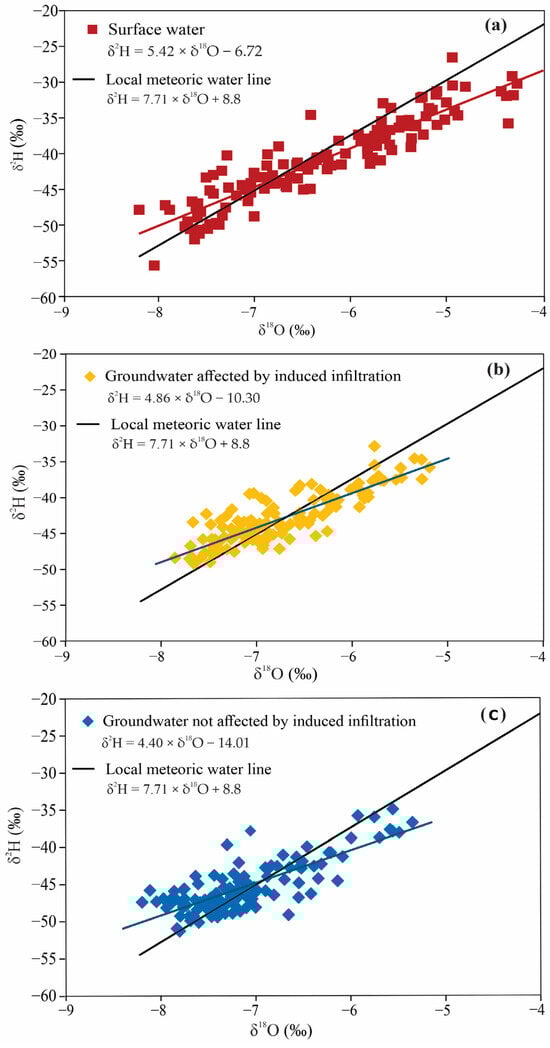 Plots of δ2H vs. δ18O for individual samples were made for (1) surface water, (2) groundwater that is affected by induced infiltration and (3) groundwater that is not affected by induced infiltration (Figure 5). We were interested in how the plots compared to the LMWL for Dayton Ohio, and whether there were any significant differences between the groups. The fitted line for surface water was δ2H = 5.42 × δ18O − 6.72 (Figure 5a). The fitted line for groundwater affected by induced infiltration was δ2H = 4.86 × δ18O − 10.3 (Figure 5b). The fitted line for groundwater not affected by induced infiltration was δ2H = 4.40 × δ18O − 14.0 (Figure 5c). The three groups’ regression slopes and intercepts were compared using indicator–variable regression analysis, as described by []. The slope for surface water (5.42) was significantly higher (p = 0.007) than the slope for groundwater not influenced by the induced infiltration of surface water (4.40). There was no significant difference between the slopes for groundwater affected by induced infiltration (4.86) and groundwater not affected by induced infiltration (4.40). Additionally, there was no significant difference between the slopes for surface water (5.42) and groundwater from monitoring wells affected by induced infiltration (4.86).