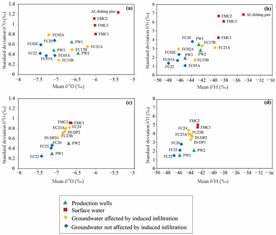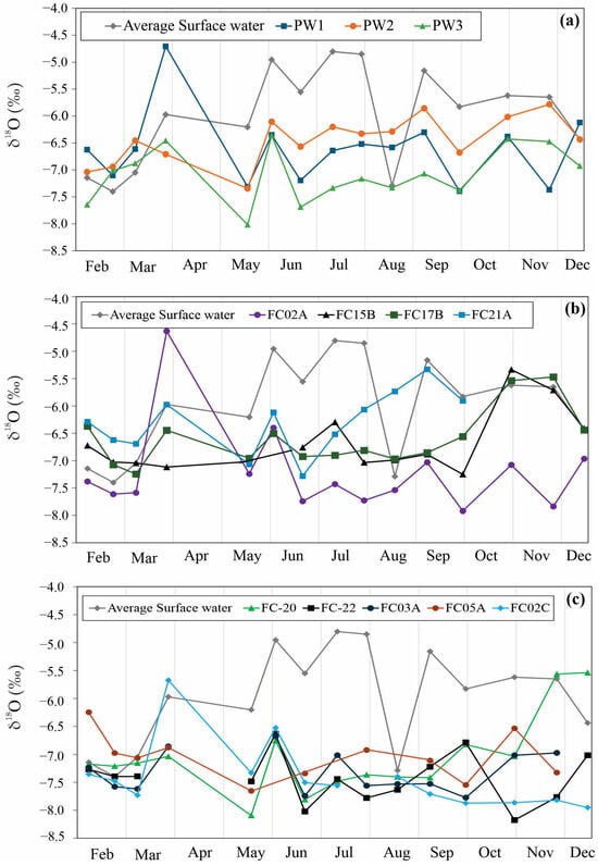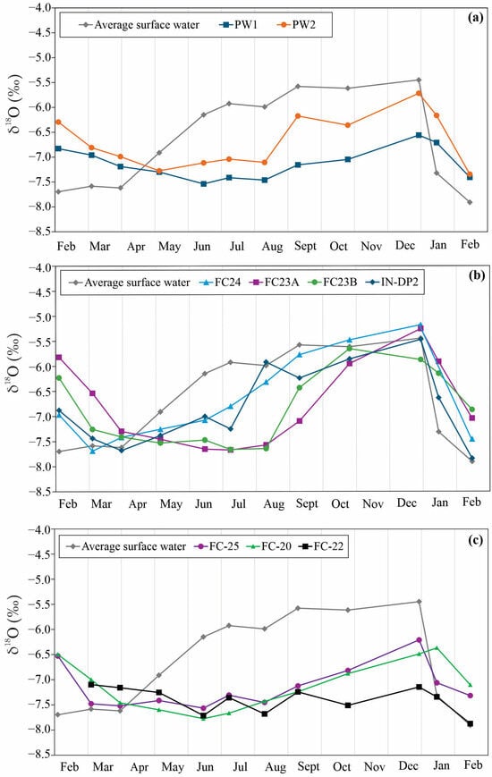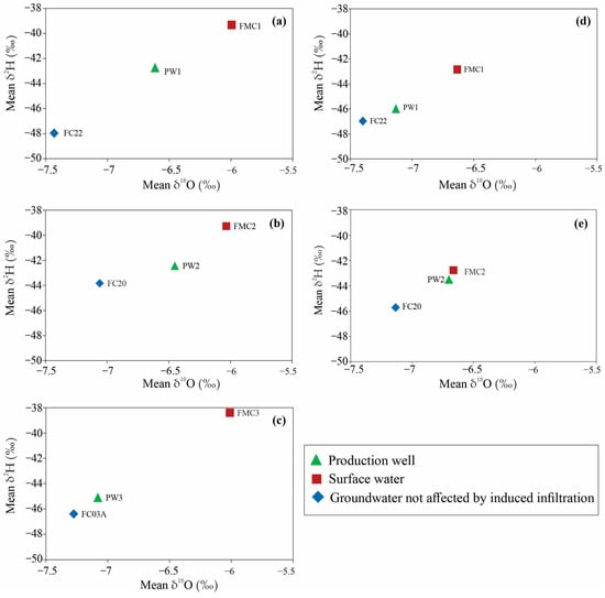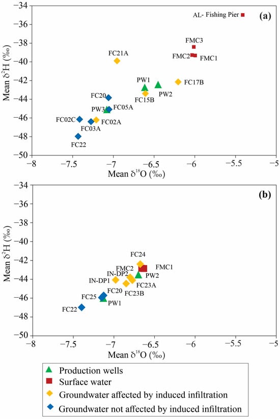 In 2021/2022, the monitoring wells identified as having groundwater that was not affected by induced infiltration were FC20, FC22 and FC25. The time-averaged δ18O values ranged from −7.40‰ to −7.13‰ with an overall mean of −7.22‰ (Figure 8b and Figure 7c, Table S8). The time-averaged δ2H values ranged from −47.00‰ to −45.71‰ with an overall mean of −46.21‰ (Figure 8b, Table S8).