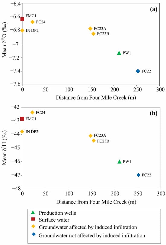 Time-averaged δ18O (a) and δ2H (b) versus the horizontal distance from the monitoring well to Four Mile Creek at the site near PW1. All isotopic values are relative to VSMOW.