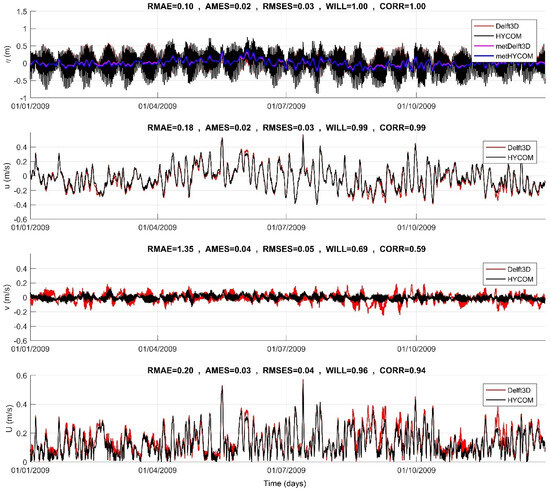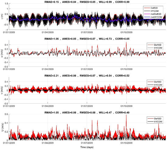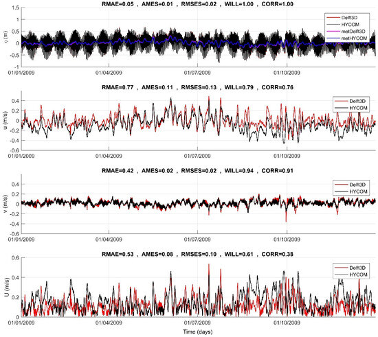 In Figure 4, a comprehensive overview of the comparison results between the coastal model (Delft3D) and the ocean model (HYCOM) for sea water levels and currents is provided. We conducted a spatial analysis of key metrics, including the linear correlation coefficient (CORR) and the absolute mean error statistic (AMES), for the modeling year 2009.