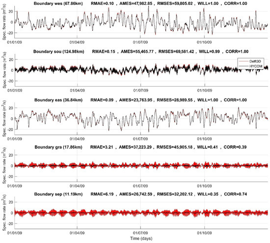 An alternative method for measuring the nesting effects involves examining the flow rates along the boundaries. Positive flow rates indicate an outward direction from the control volume. At both the western (where P01 is situated) and eastern boundaries, meteorological forcing predominantly influences the flow rates, with specific flow rates being comparable, as revealed in Figure 10. Along the southern boundary (where P02 is located), the flow rate is significantly shaped by the onshore–offshore tidal flow, with specific flow rates approximately half the intensity observed along the western and eastern boundaries. As anticipated, at Points P04 and P05, situated at the entrances of the bays (gra and sep), the flow rates are also substantially dictated by the tidal dynamics, with a slightly greater impact of meteorological forcing observed in Ilha Grande Bay (gra).