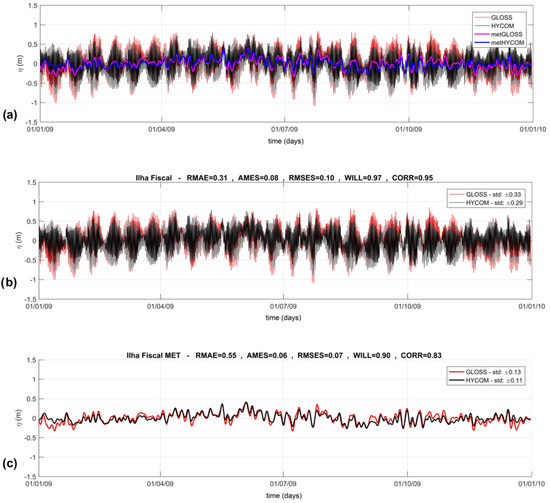 To validate the outcomes of the ocean model, the HYCOM, a comparison of the sea level time series was conducted, encompassing the entire dataset and considering astronomical and non-astronomical signals. We compared Fiscal Island gauge station data (as shown in Figure 12) with the model results obtained at the entrance of Guanabara Bay (as illustrated in Figure 1).
