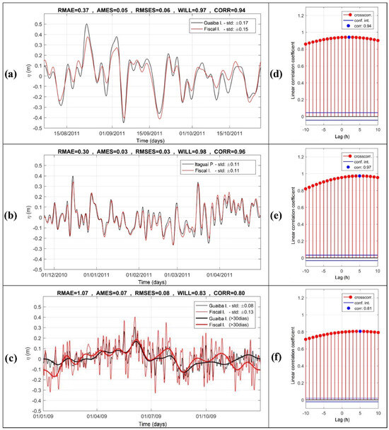 The water level data for Sepetiba Bay were obtained from two sources: Guaíba Island for the period from 6 August 2011 to 26 October 2011 [54] and Port of Itaguaí from 23 November 2011 to 30 April 2012 (MICROARS Consultoria e Projetos LTDA, Rio de Janeiro, Brazil) (Figure 3). Time series data comprise a combination of linear components, periodic or quasi-periodic components, and high-frequency signals. To isolate the meteorological signal from the high-frequency components, a spectral filter with a high-pass filter using a Discrete Fourier Transform was applied. This process was performed in MATLAB R2019a, following the method described by Cerqueira et al. [55]. The high-pass filter effectively removes signals with periods smaller than 3 days, focusing on the remote meteorological signal. This approach is consistent with the practice widely used in oceanographic research [17,19,29,56].