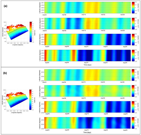 Comparing the meteorological forcing represented by the ocean model to available data reveals that the main features align well with the observed conditions in the area. Notably, the propagation speed exhibits northward movement in phase with the sea level, characteristic of coastal trapped waves. While this pattern aligns with literature reports, there is an observed underestimation of the signal’s intensity, which has also been reported previously. Furthermore, the coastal model highlights a further attenuation of the meteorological signal’s intensity near the coastline.