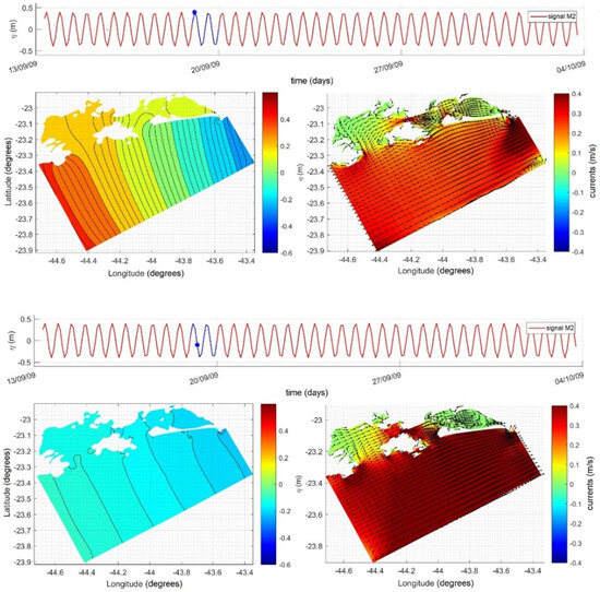 Spatial variation in sea levels (on the left) and currents (on the right) in the Delft3D results for simulation considering only the M2 component with a lag of 4.92 h between the southern and northern borders for the following times from 19 September 2009 (from top to bottom): 2 h; 6 h; 10 h; 12 h. The instant represented by the spatial distribution is presented with a blue point in the time series of the artificial wave inserted at the model’s boundary, at the top of the images.