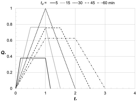 The MRM, an American Society of Civil Engineers (ASCE) standard practice for designing urban stormwater systems ([45] ASCE 2006, Section 4.1.8), which also is applied worldwide [46,47], relies on the same assumptions as those of the rational formula and the notion that the runoff coefficient C is constant with respect to time and rainfall intensity during a storm. For td = tc, runoff hydrographs are constructed by considering discharge to increase at a linear rate from the start of rainfall over a period tc and then decrease at a linear rate over a time tc. When td > tc, the entire catchment area A contributes to the flow at the outlet, and discharge remains constant at the peak rate Qp for the period. The discharge then decreases at a linear rate over tc. When td < tc, the flow increases linearly to reach Qp at time td and then remains constant until t = tc. The flow rate then drops at a linear rate over a period td. The total duration of runoff equals tc + td under all circumstances. Finally, based on MRM reasoning, the fraction of the catchment draining to the outlet when td < tc equals the ratio td/tc, which gives