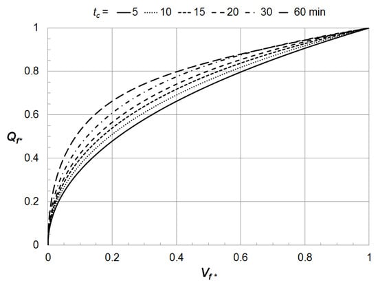 The flow rate Qf corresponding to a specified first flush runoff volume is obtained in the following analysis from appropriate MRM hydrographs such as those shown in Figure 1. As explained, if a specified first flush volume fills before the hydrograph peak discharge is reached, the volume corresponds to a unique flow rate used to design a control measure. However, suppose the peak discharge occurs before capturing the first flush runoff volume. In that case, the diversion structure or filtering device must be sized based on the maximum peak discharge from the catchment, which occurs when td = tc. One can determine quickly if the specified capture volume fills before the peak discharge is reached by comparing it to the runoff volume under the rising side of the triangular hydrograph produced when td = tc. If then ; otherwise, and does not need to be determined based on MRM runoff hydrographs for which