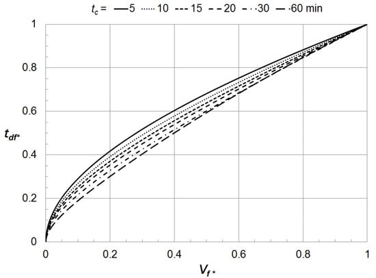 If the specified volume does not fill until t > tc and the control devices must be designed for a flow rate equal to . When , the appropriate hydrograph that generates a runoff volume of Vf at its peak (that is, when t = td) must be determined to obtain the corresponding value of , which defines the normalized first flush design flow rate .