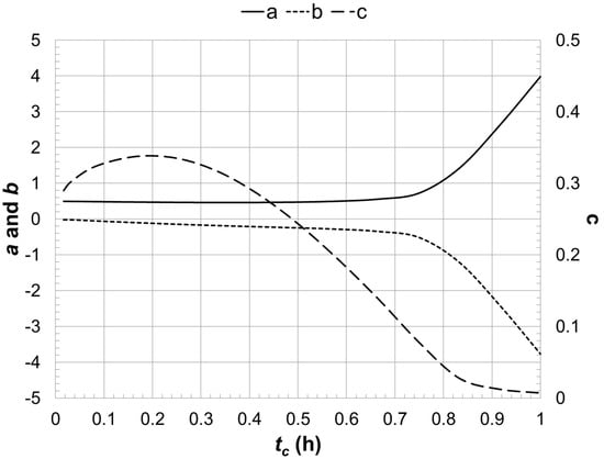 where a, b, c = coefficients that are functions of tc. Optimal values of a, b, and c for tc ranging from 1 min to 60 min are given in Table 1 and are plotted in Figure 5. Relations for a, b, and c shown in Figure 5 are matched closely through the following expressions: