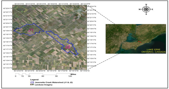 The baseline model was set up with BMPs implemented in the J1 and J2 watersheds for the period of 2016–2017 (i.e., banding and incorporation of P, variable rate P application, below canopy application of P, variable rate of P + incorporation of P, and conservation tillage and cover crops). Historical land management practices and crop rotation data for seven years (2011–2017) provided to the model for such fields as J165, 61, 62, 63, and 75, and J204, J2E4, J205, J207, J212, J213, J224, J232, J233, J238, J239, J241, and J244, while, for the remaining fields, the two-year land use datasets (2016–2017) were used. Details of the BMPs that were practiced in the Jeannette Creek watershed in 2016 and 2017 are given in Table S2. This table also provides a field-wise description, along with their modified parameters used during the model built-up for existing BMPs.