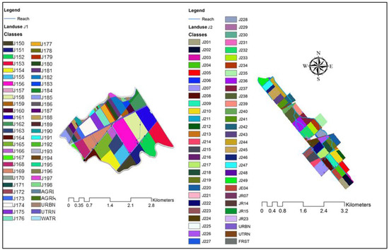 When modelling agricultural watersheds with the SWAT model, accurate land management data inputs play a significant role in ensuring the accurate simulation of runoff, sediment, and nutrient loads. Land management information includes date/month of tillage operations, sowing/planting dates, type and rates of fertilizer application, harvest/kill date, etc. Field-by-field information from the farmers of the cropped areas in the J1 and J2 (Jeannette Creek) watersheds (Table S1) was similarly drawn from a 5-year farmer land management survey report provided by the LTVCA. To represent the land management data on a field-wise basis, land use maps were again classified, such that each field was assigned a particular land use code (Figure 4).