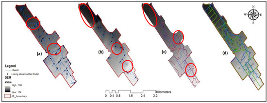 For instance, Figure 5a,b show that the model was clearly unable to delineate the pattern of streams with the 30 m × 30 m DEM. In the case of Figure 5c, the natural streams were burned based on a 0.5 m × 0.5 m Hydro-Enforced DEM, but the model remained unable to delineate some portions of the watershed, as highlighted by the red circles. Figure 5d displays an appropriate delineation of the stream network, with pre-defined streams within sub-watersheds, allowing the routing of streams node to node. Thus, the pre-defined approach was applied to delineate the watershed.