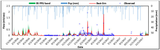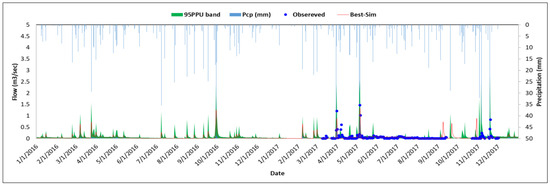 Figure 8 displays a time series plot of stream flow and precipitation, with the 95% PPU band, generated from the SWAT-CUP based on the range of parameter value for the J2 watershed. In this plot, the final range of streamflow parameter values were used in an uncertainty analysis. The low and high peaks of streamflow from the watershed corresponded with precipitation amounts. Showing model performance parameter statistics, Table S4 reflects an overall qualitative rating that can be considered as ‘good,’ based on the values of PBIAS (9%), NSE (0.6), and R2 (0.71) [35]. In addition, the 95% PPU indicates that 30% of the observations (p-stat = 0.3) were compressed within a comparatively thin band (r-stat 0.12), which further confirms that the model performance statistics are within the acceptable range.