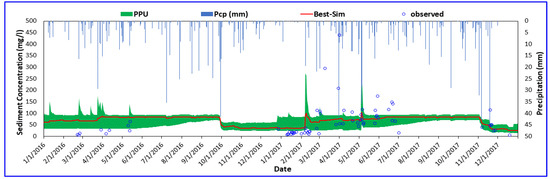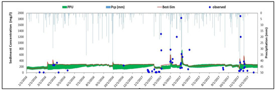 The results displayed in Figure 9 and Figure 10 represent time series plots featuring simulated sediment concentration and precipitation, with a 95% PPU band for both watersheds. The low and high peaks of streamflow in the watershed corresponded with a similarly high precipitation amount. While a thorough model validation was hindered by the unavailability of continuous observations, the plot indeed shows that the model simulations captured the trend of observations during the calibration periods.