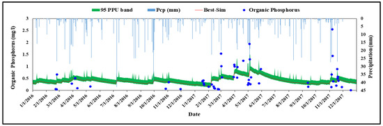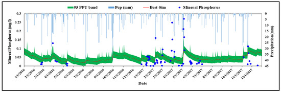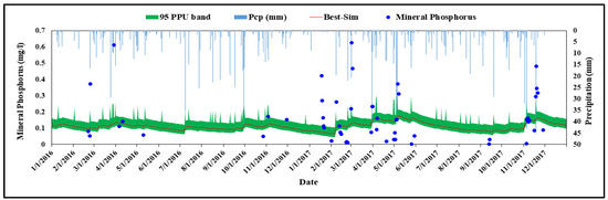 The overall average annual yield over the period of two years was 0.20 kg ha−1. The low and high and corresponded well with high and low streamflow patterns at the pump outlet. The model performance statistics showed a very good PBIAS (6%) for and a satisfactory one (22%) for . The NSE for (0.15) and (−0.03), along with the R2 for (0.16) and (0.03), were found to be ‘unsatisfactory.’ Thus, for , the uncertainty band summarized only 62% of the observations (p-stat = 0.62) and was compressed in a relatively thick band (r-stat = 1.82), whereas, for the 95% PPU band summarized 77% of the observations in a relatively thick band (r-stat = 1.94). Based on the PBIAS, the model’s performance in predicting temporal trends was satisfactory, but it was unsatisfactory for concentrations. Again, this is due to the comparison of instantaneous observed concentration with the daily simulated concentrations. Overall, based on the trends, the performance of the model to simulated P was poor but approaching a reasonable range [35,36,37].