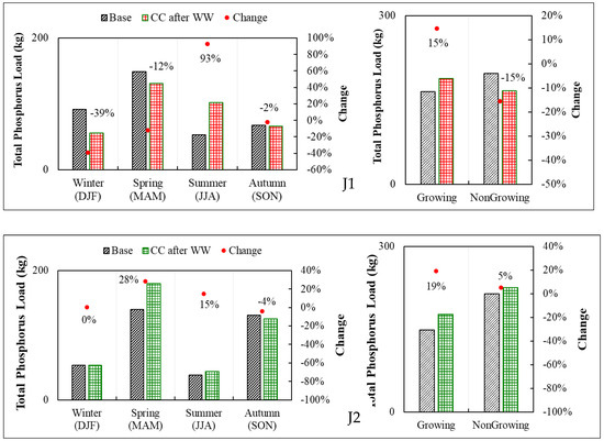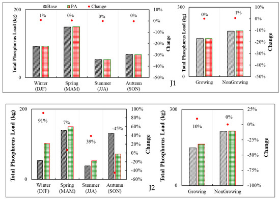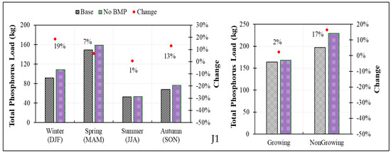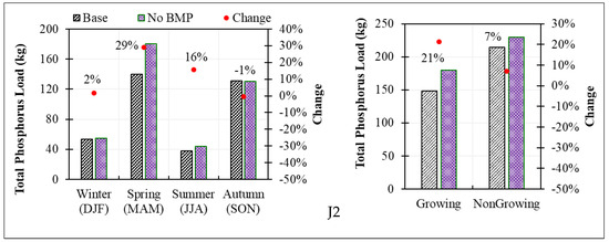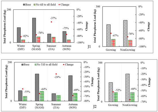 The load reduction pattern in the growing and non-growing seasons was similar for both watersheds. For the non-growing season, the reduction in P transport was 76% in J1 and 66% in J2, whereas, in the growing season, the rate of reduction was 67% for J1, and 52% for J2. In the J1 watershed, the maximum reduction (82%) occurred during winter, followed by the spring (76%), fall (75%), and summer (37%) seasons. For the J2 watershed, the maximum reduction (69%) occurred during the fall, followed by the spring (64%), winter (55%), and summer (24%) seasons (Figure 17).