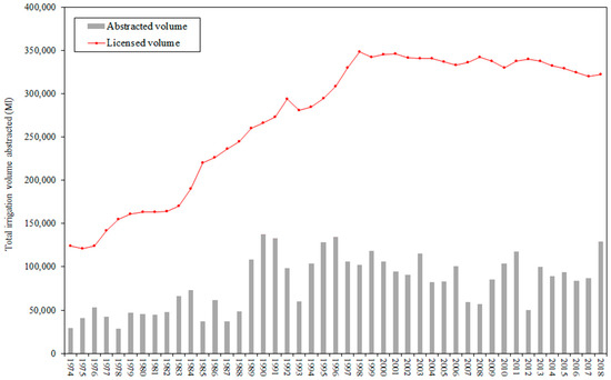 Total licensed and abstracted volumes of water for agricultural irrigation in England between 1974 and 2018 (Source [4]).