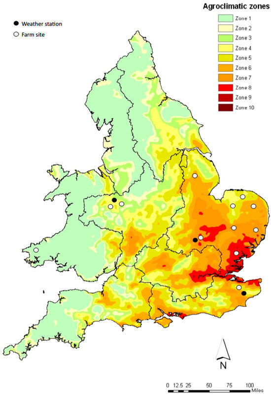 Case study farm data: The peak monthly and peak daily ratios derived from the IWR model were compared against observed field data aggregated from 12 commercial farms, chosen to encompass the range of agroclimatic conditions under which irrigation is typically practiced in England, together with a range of irrigated crops and soil types. The location of the three weather stations used for the IWR modelling in relation to the 12 farm sites and the spatial variation in agroclimate across England and Wales is shown in Figure 2. The agroclimate zones are based on the maximum annual potential soil moisture deficit (PSMDmax), which reflects the balance between rainfall and reference evapotranspiration (ETo) and has been used extensively in international irrigation research to assess agroclimate impacts on irrigation (e.g., [12]). The farm sites were also deliberately chosen to represent irrigators that were not constrained by water resources availability and/or irrigation application equipment, which would implicitly impact on their peak abstraction rates. A site visit to each farm was undertaken, and a detailed study of irrigation equipment and management practices completed. Data collected included information on irrigated crop types and their areas (ha), water sources, irrigation scheduling practices, and application equipment, including analysis of pumping capacities. For each site, 6 years (1995–2000) historical irrigation data were obtained, which included a particularly dry year (1995) in irrigation terms. Using similar approaches to those described earlier, the peak monthly-to-annual and peak daily-to-annual ratios for each site were estimated.