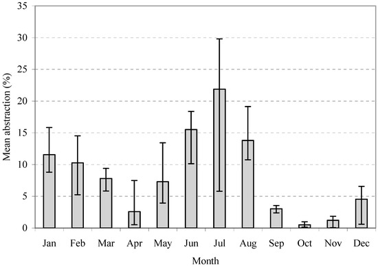 National abstraction data: The monthly pattern of irrigation abstraction in the EA Anglian Region is shown in Figure 5, expressed as the percentage of the mean monthly abstracted volume to the mean annual abstracted volume. Over the period studied, July, on average, represents the peak month for abstraction, accounting for approximately 22% of total annual abstraction. The mean monthly variation between years is also shown. The timing of abstraction demand for the top 10% of licensed abstractors in the region for the summer period (April to September) is shown in Figure 6, expressed as the ratio of mean monthly abstraction to total summer abstraction. The mean monthly variation between years is also shown. The data confirm that, on average, between 30% and 40% of total summer abstraction occurs in July, the peak month. However, on individual farms, this proportion was often much higher, perhaps, for example, where an abstraction licence was being used to irrigate specialist crops.