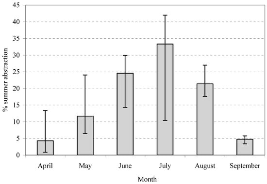 Monthly pattern of summer abstraction for spray irrigation for the top 10% of licensed summer abstractors in Anglian Region (1997–2001). Error bars show inter-annual variation from the mean.