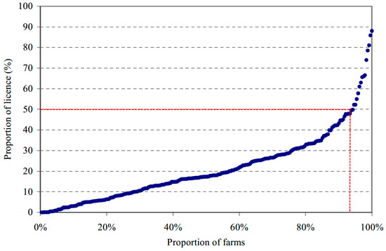 The variation between approximately 250 farms in the proportion of the licensed volume abstracted in the peak month is shown in Figure 7. This shows that setting a 50% peak monthly-to-annual ratio (as suggested in Section 3.1) would have satisfied 95% of irrigation abstractors’ needs. An analysis of the frequency distribution of these irrigated holdings confirmed that those whose peak monthly demand exceeded 50% accounted for only 6% of total abstraction in that year. These are likely to be small area farms, with small licenses, but irrigating high-value, shallow-rooting crops.