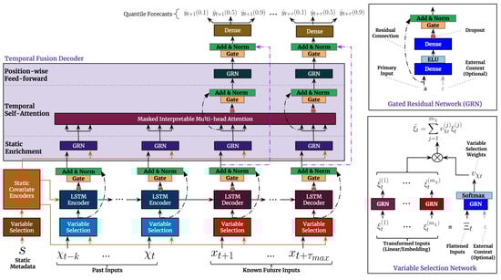 TFTs are characterised by their flexibility concerning the input data to be taken into account, which means that they can consider known inputs from past and future time steps as well as static variables. This makes TFTs suitable for a wide range of problems. The overall architecture and individual components of a TFT are shown in Figure 2. In contrast to the transformer architecture developed by Vaswani et al. [34], the basis is an encoder–decoder structure that uses recurrent long short-term memory (LSTM) layers instead of multi-layer perceptron (MLP) layers. Combining the LSTM cell-based encoder–decoder structure with the multi-head attention used in the original transformer enables TFTs to learn both long-term and short-term temporal dependencies. Another component of the TFT architecture are gated residual network (GRN) blocks, which can be found at various points in the overall architecture. These blocks allow unused components to be skipped, which enables the network to adapt its depth and complexity to different tasks and datasets. In addition, the TFT contains variable selection networks (VSN) blocks that accept network inputs and identify the most important input variables while ignoring less relevant inputs. For this purpose, weightings are calculated depending on the influence of the input characteristics on the target variable, making the model interpretable to a certain degree.
