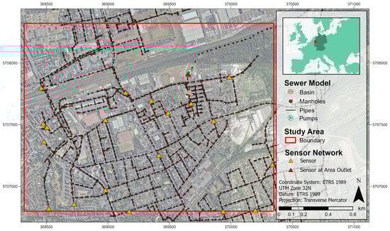 Illustration of the study area’s sewer network and the artificial sensor network.