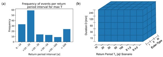 Distribution of events in the dataset. (a) The maximum return time T distribution for all 153 natural rainfall events. (b) A schematic representation of the design rainfall events, with the selected durations, model rainfall types, and return periods/scenarios. For scenarios S 1.5 and S 4.0, the number indicates the increase factor by which the values of the 100-year design rains were multiplied [30].