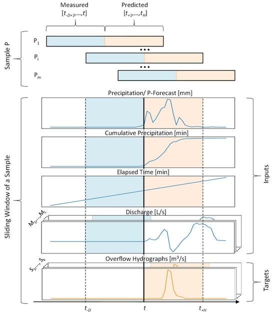 The model structure shown in Figure 1 was used in this work to predict overflow from sewer manholes. The machine learning model aimed to learn the relationship between the overflow hydrographs at the manholes in the catchment area, as the target variable, and the explanatory variables of precipitation information, predicted precipitation information and measurements in the pipes of the sewer system. The precipitation information included the precipitation intensity, the total accumulated precipitation and the elapsed time since the event’s start. As in similar studies [25,27,28,32], the overflow hydrographs and the in-channel measurements were generated using an HD model. This approach was adopted due to insufficient measurement data for the learning problem described. Accordingly, the model functions as a surrogate to generate the results of an HD model of nearly equivalent quality and in just a few seconds, so it is viable to be implemented in real-time warning systems.