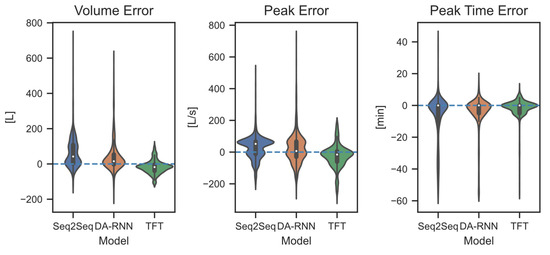 Since the selected measurement signal has only a minor effect on the prediction quality, only models with filling classes as input were considered for further analyses. This is because this measurand is the least precise of those tested, so it is more likely to be captured with low-cost sensors. In addition, the variant with one station was considered in the subsequent sections, as the best overall result was obtained with this variant. The model performance of the three best models—Seq2Seq, DA-RNN, and TFT—for the variant with filling classes at one measuring station was analysed in more detail. For this purpose, the violin plot shown in Figure 6 was created for the individual metrics and models. The plot relies on the same metric values used for calculating the mean values in Table 2. Based on the violin plot, the scattering and density of the results are visualised. This clearly shows the better performance of the TFT, which has the least scatter for all metrics and where the highest density of the metrics is close to the optimum in each case. Unlike the Seq2Seq and DA-RNN models, large outliers occur only in the peak time error for the TFT. These appear in the case of long, uniform overflow events, which somewhat weaken their relevance in the overall result analysis. The TFT slightly underestimates the volume and peak value compared to the other models. However, as only forecasts of extreme events with more than 500 litres of overflow volume were taken into account, these deviations are tolerable. Since the results for other measurement signals are similar, no additional visualisation is provided.