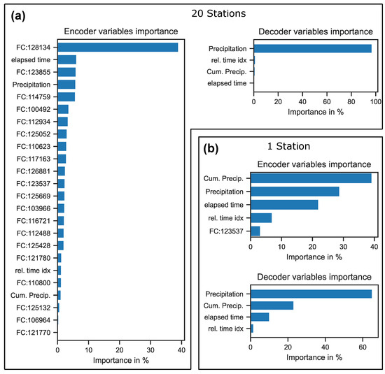 Feature importance of the encoder and decoder inputs for (a) the variant with 20 stations and (b) the variant with 1 station. The features with FC at the beginning indicate measurements of the filling classes with the respective station ID.