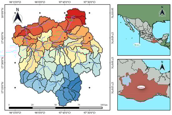 The study area corresponds to the Mixteco River Basin (MRB). Its main channel originates from the confluence of the Tlaxiaco and Juxtlahuaca rivers; its delimitation begins from the mountainous region to the Mariscala hydrometric station (17°51′45″ N; 98°08′58″ W), with an approximate length of 180.16 km, and it becomes a major tributary of the Balsas River [] (Figure 1).