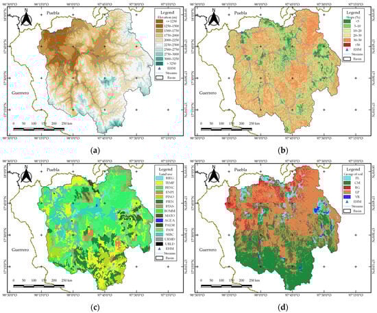 The plant cover of the MRB corresponds mainly to forests (44.95% of the basin; Figure 2c). The most representative plant cover is oak forest (BENC, 21.54%), followed by pine-oak forest (ENPI, 10.74%), pine forest (PINE, 6.43%), oak–pine forest (ENPI, 3.31%), tascate (BTAS, 2.26%), and mountain cloud forest (BOMM, 0.67%). The area also harbors induced pastures (PASI, 21.85%), rainfed agriculture (TEMP, 19.02%), and low deciduous forest (SEBC, 10.06%). The remaining area is covered by irrigation agriculture (RIEG, 1.77%), scrubland (MATO, 1.58%), induced palm-tree forest (PALM, 0.44%), medium-density urban area (URMD, 0.24%), low-density urban area (URLD, 0.07%), and water bodies (WATER, 0.04%). The main soil classes in the MRB, according to the FAO WRB Classification System (FAO, 2014), are Leptosols (LP; 48.25%), followed by Cambisols (CM; 35.80%), Regosols (RG; 8.00%), Fluvisols (FL; 7.16%), and Vertisols (VR; 0.79%) (Figure 2d).