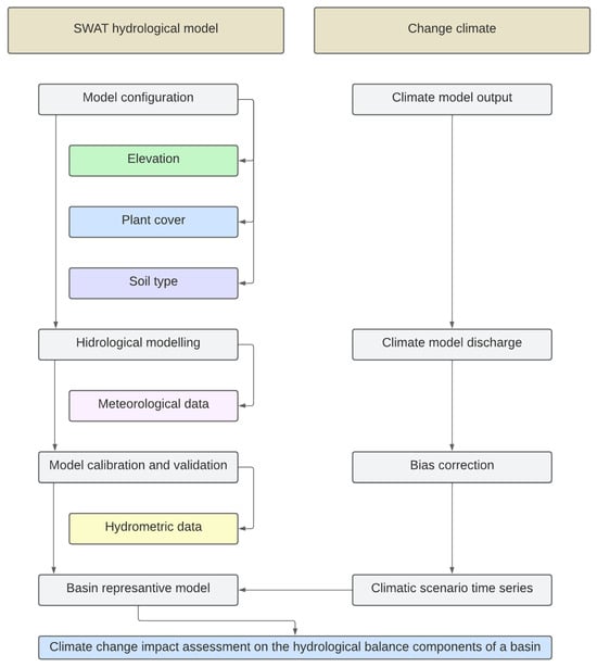 Figure 3 illustrates the climate change assessment process using the SWAT model and its integration with Global Climate Models (GCMs), according to Saade et al. []. First, the river basin is delimited from the Digital Elevations Model (DEM), then, it is subdivided into multiple sub-basins and each of these is divided into Hydrological Response Units (HRU), depending on the slope, soil type, and plant cover. The simulation of the hydrological cycle can be divided into terrestrial phase and routing: the first determines the water load in the main channel, and the second is the flow of these loads through the different channels of sub-basins toward the outputs []. The simulation is performed for each HRU, including precipitation, interception, surface runoff, evapotranspiration, leaching, lateral flow through the soil profile, and return flow of shallow aquifers; this provides greater certainty and better describes the hydrological balance of the basin [].
