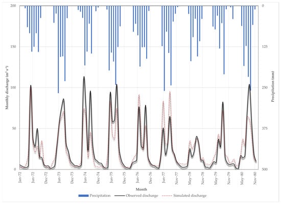 The average surface runoff observed at the MRB stream flow measurement hydrometric station was 24.38 m3 s−1, while hydrological modeling gave a value of 23.76 m3 s−1. The performance of the SWAT model showed good results in simulating surface runoff production during the calibration stage (R2 = 0.86; NSE = 0.83; PBIAS = 13.93%) and validation stage (R2 = 0.78; NSE = 0.76; PBIAS = −17.03%) as shown in Figure 4. Therefore, it meets the evaluation criteria []. In general, the model simulation result slightly underestimates the high flows that occur during the rainy season.