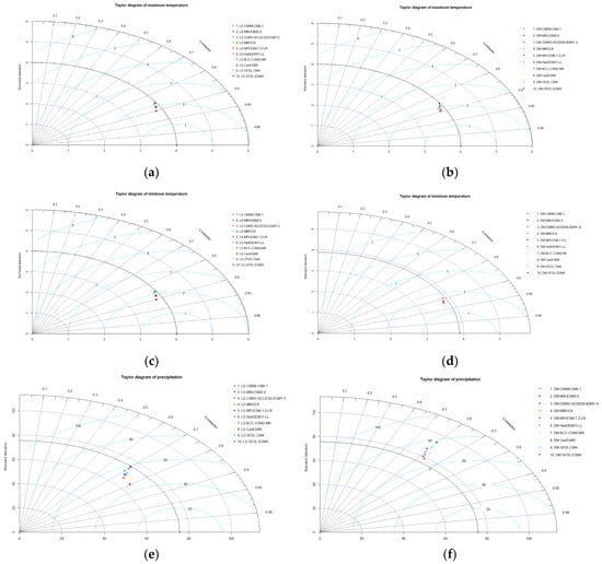 Taylor diagrams: (a) maximum temperature with the LS method; (b) maximum temperature with the DM method; (c) minimum temperature with the LS method; (d) minimum temperature with the DM method; (e) precipitation with the LS method; (f) precipitation with the DM method.