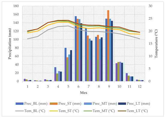 Frequently, GCMs involve a considerable bias in precipitation and temperature, mainly due to the influence of relief [,]. Therefore, bias correction is necessary to minimize the discrepancy between the time series of climate model analysis variables and observed data [], in order to model the components of hydrological balance properly.