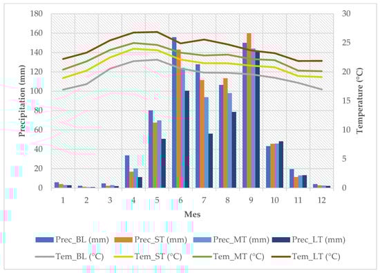 In the MRB, the baseline mean annual precipitation is 733.55 mm, and the mean annual temperature is 19.43 °C. However, climate change scenarios foresee changes in both variables. The SSP245 scenario of GCM MPI-ESM-1-2-LR predicts a decrease in precipitation and a rise in the mean annual and monthly temperature. In the case of precipitation, a reduction of 44.44 mm is projected in the short term (2025–2049), 76.42 mm in the medium term (2050–2074), and 83.71 mm in the long term (2074–2099), while temperature will increase by 1.60 °C in the short term (2025–2049), 2.31 °C in the medium term (2050–2074), and 2.57 °C in the long term (2075–2099). Figure 6 illustrates the monthly behavior of both variables for the SSP245 scenario, showing a decrease in precipitation mainly during the rainy period and a rise in monthly mean temperature from November to April.
