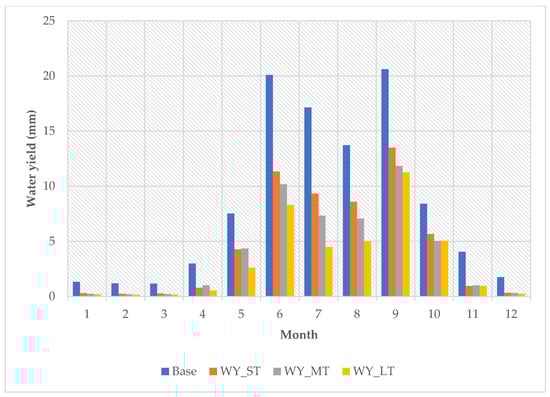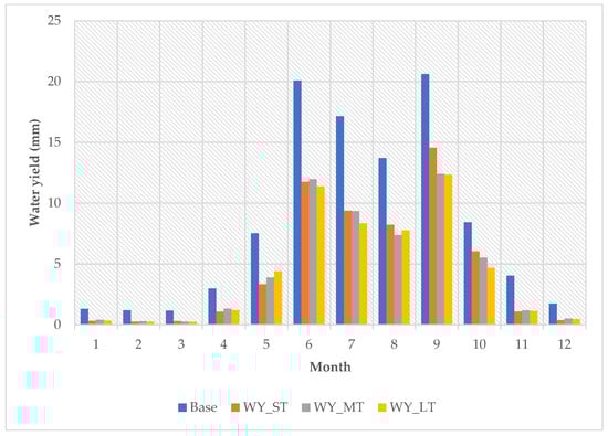 Based on the hydrological modeling of the MRB, the baseline corresponded to the values of the hydrological balance components from 1972 to 1980. Table 6 shows the monthly precipitation values (PCP), surface runoff (SR), lateral flow (FL), evapotranspiration (ET), water yield (WY), and potential evapotranspiration (PET). Generally, the annual and monthly averages of a basin’s different hydrological balance components show a direct relationship between precipitation and its other components. According to Desai et al. [], the largest volume is released to the atmosphere through evapotranspiration, mainly due to the association between the spatial distribution of plant cover and temperature; in the particular case of the MRB, this accounts for 65.68% (481.80 mm) of precipitation. WY refers to the annual amount of water that leaves the basin, with a value of 13.63% (99.97 mm). Finally, the value of SR is only positive during the rainy season because the MRB is characterized by hydrological droughts during the third part of the year, with which flow production decreases considerably [].