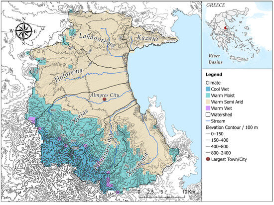 Map of the Almyros Basin, the climatic zones, the watersheds, the largest town/city of basin, and the contoured elevation of the wider area.
