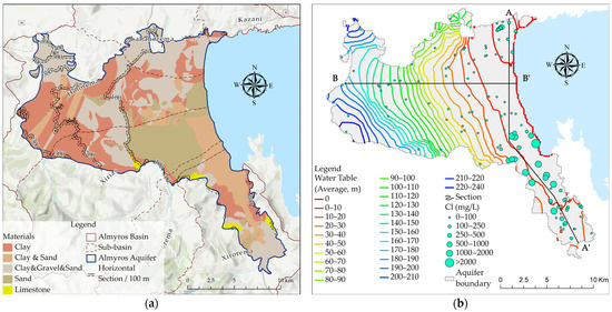 (a) Hydrogeological formations within the Almyros aquifer [36]. (b) Mean hydraulic heads from the integrated modelling system, with the average observed levels of chloride concentrations during the historical period, spanning from 1991 to 2018, and cross-sections AA’ and BB’.