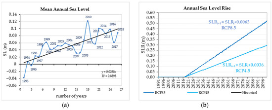 (a) Mean annual sea level for the period 1991–2018 according to [48]. (b) Simulated sea level rise for the period 1991–2100.