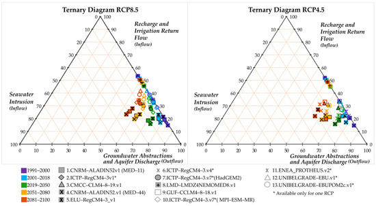 The results of the simulations of the integrated modelling system regarding the water balance for the two climatic scenarios and climatic models are depicted in Figure 4. The ternary diagram was employed for analyzing the components of the water budget of the aquifer system, particularly in the context of seawater intrusion, groundwater recharge, irrigation return flow, groundwater abstractions, and aquifer discharge. The grouping of the variables was firstly considered, namely which components held the inflows and the outflows of the aquifer system. The aquifer outflows consisted of groundwater abstractions, while the aquifer inflows were considered separately. Water inflows from the sea are displayed on the left side of the triangle, while water inflows from groundwater recharge and irrigation return flows are the displayed on the right side of the triangle. Then, the original values of the results were normalized as percentages. The normalized percentages of the components of the water budget were displayed as averaged annual values of the three components for the periods of 1991 to 2000, 2001 to 2018, 2019 to 2050, 2051 to 2080, and 2081 to 2100. These factors are represented by the three equilateral triangle corners, and all potential combinations of the three are shown on each side. The ideal distribution would be 0% seawater intrusion, 50% groundwater recharge and irrigation return flows, and 50% groundwater abstractions and aquifer discharge, for freshwater to not be contaminated with seawater, and for permanent groundwater reserves to not be consumed for water needs. Through the placement of the proportional relations of the components of the groundwater budget as points within the triangle, the diagram allows for a thorough examination of how seawater intrusion, groundwater recharge, and groundwater abstractions interact and impact the distribution of freshwater in the aquifer system.