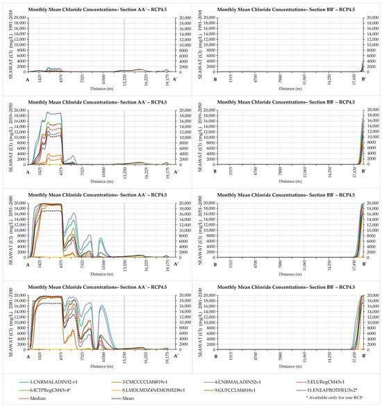 In the case of the climate scenario RCP 4.5 in Figure 6, in Section AA’, the highest chloride concentrations are produced on the northern coast, when using the bias-corrected climatic models 4.CNRMALADIN52v1 (MED44) and 1.CNRMALADIN52.v1 (MED11), the values of which are similar to the values of RCP8.5. However, the model 5.ELURegCM43v1 presents lowered chloride concentrations, compared to RCP8.5. The greater differentiations among the models again present in the areas of sandy and clayish materials in the middle of the coastal region, originated from the same climatic models. In Section BB’, the seawater wedge appears similar to the distributions of RCP8.5, with no significant variations in the maximum values of accumulated chlorides from seawater intrusion.
