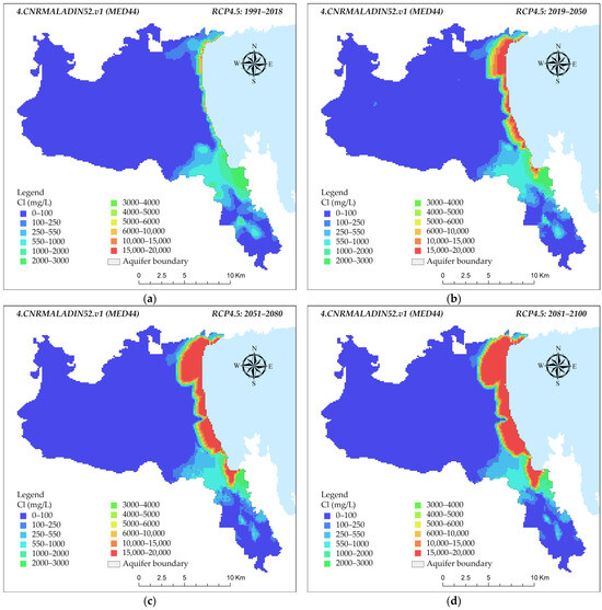For RCP8.5, the simulated data were derived from the bias-corrected 4.CNRMALADIN52.v1 (MED44) model, which yields the maximum seawater intrusion and is illustrated in Figure 7. The average chloride concentrations during the period of 1991–2018 are aggregated mostly in the northern coastal region and the southern coastal strait of the aquifer system (Figure 7a). The values of chloride concentrations range from 100 mg/L to the colored class of 6000 to 10,000 mg/L, with local points exceeding 10,000 mg/L. The progression to the next time period (2019–2050) shows significant increases along the whole coastline (Figure 7b). The aggregation of chlorides falls in the colored class of 15,000 to 20,000 mg/L, and the groundwater at the coastal area is salinized almost up to the concentration of chlorides in seawater. Seawater intrusion appears most intense and fierce in the north, and in the central southern coastal areas. Moving on to the subsequent time frame (2051–2080), the chloride concentrations reach the levels of seawater and take over 1.5 km of the whole coastline and coastal area inland (Figure 7c). Seawater intrusion shows variations in expansion among the northern, the central, and the southern coastal areas. During the final time period (2081–2100), seawater intrusion shows extreme intensification (Figure 7d). The aggregation of chlorides reaches the levels of seawater and expands over 2 km inland, while the course also shifts into the southern part of the aquifer system. For RCP4.5, the simulated data are derived from the bias-corrected 4.CNRMALADIN52.v1 (MED44) model, which yields the maximum seawater intrusion and is illustrated in Figure 8.