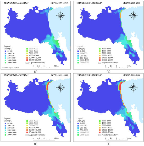 For RCP8.5, the simulated data are derived from the bias-corrected 12.UNIBELGRADEEBU.v1* model, which yields significant seawater intrusion levels and is illustrated in Figure 10. The average chloride concentrations during the period of 1991–2018 are aggregated mostly in the southern coastal strait of the aquifer system (Figure 10a).