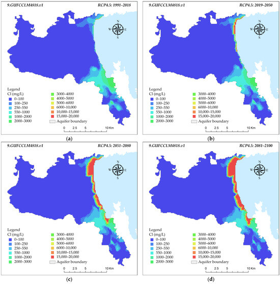 For RCP4.5, the simulated chlorides are derived from the bias-corrected 9.GUFCCLM4818.v1* model, which yields significant seawater intrusion levels and is illustrated in Figure 11. The average chloride concentrations during the period of 1991–2018 are aggregated mostly in the southern coastal strait of the aquifer system (Figure 11a). The values of chloride concentrations range from 550 mg/L to the colored class of 4000 to 5000 mg/L, while no local increases occur. The progression to the next time period (2019–2050) shows significant increases along the northern coastline and down along the central coast (Figure 11b). Seawater intrusion reaches the chloride concentration of seawater in the north, over 15,000 mg/L, and the inward expansion is limited, compared to the results of the previous model, with more adverse impacts. The chloride concentrations seem relatively stable in the southern coastal strait of the aquifer. Moving on to the subsequent time frame (2051–2080), the seawater intrusion levels show variations in expansion among the northern, central, and southern coastal areas. Seawater intrusion appears most intense and fierce in the northern, central, and southern coastal areas. The chloride concentrations reach the levels of seawater and take over approximately 2 km of the inland northern coastal area, and 1 km of the inland southern coastal area (Figure 11c). The phenomenon appears to quickly exacerbate during this time frame. During the final time period (2081–2100), seawater intrusion shows evident intensification (Figure 11d). The chloride concentrations take over more than 2 km of the northern coastal area, approximately 1 km of the central coastal region, and 2 km of the southern coastal area. Remarkably, an inland shift of seawater is detected in the southern strait of the aquifer. The phenomenon appears exacerbated and adverse during the last time frame of the century.