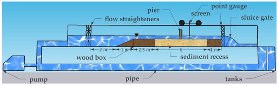 The area devoted to scouring processes spanned a length of 6 m, a depth of 0.15 m, and a width of 0.3 m. An upstream wooden box measuring 3.5 m in length seamlessly transitioned from the inflow sluice to the scour zone. The depth was reduced from 0.55 m to 0.15 m using the 1.5 m-long inclined surface of the box. A thin layer of sediment was uniformly distributed over this box to maintain the continuity of bed roughness. A volumetric flow meter determined flow in the channel with a specified accuracy of ±1%. Furthermore, an electronic flow rate gauge installed in the flume discharge system offered precise measurements with an accuracy of ±0.05%. Within the sediment recess, where the principal investigations took place, the presence of the bridge pier and the underlying base material was a defining characteristic of the experimental scenario. The dimensional assessment and resemblance theory concepts served as a systematic framework for choosing the parameters of the experimental model.