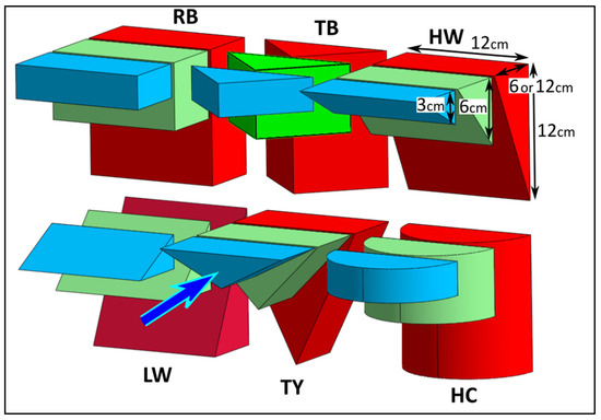 Figure 2 shows the various debris shapes used in the experimental program perpendicular to the flow direction. The debris’ width and length (downstream) measured 0.12 m and 0.06 m. Notably, the height of the debris varied across three distinct settings: 0.03 m, 0.06 m, and 0.12 m, facilitating a detailed investigation into their individual effects. The depicted debris forms include:
