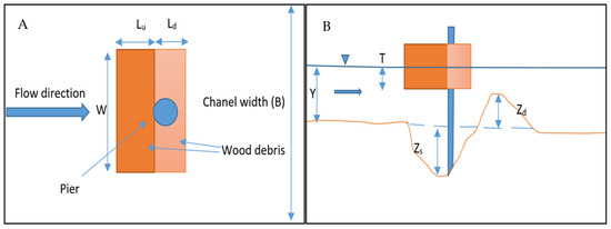 Flow conditions, stream geometry, pier configuration, and debris characteristics influence the shape and quantity of debris accumulation [17]. Debris can restrict the channel’s cross-section, increasing flow velocities that exacerbate scouring and sediment removal [18]. Debris accumulation can vary in size and shape, ranging from small debris clusters upstream of a pier to near-complete blockages of the bridge’s entrance channel [19]. Past studies [18] have identified two primary shapes for debris accumulations: rectangular and triangular. These shapes depend on elements such as the characteristics of transported debris and the waterway’s shape. Cylindrical bridge piers, especially those wider width are particularly prone to debris clogging [20]. Pagliara and Carnacina [21] studied the effect of the shape and obstruction area of debris on the degree of pier scouring. They found that the obstruction area had a more significant effect than the frontal shape on the maximum scour hole depth. However, they only focused on three debris shapes, namely rectangular, triangular, and cylindrical, with a fixed upstream length that did not extend downstream of the pier. They later investigated the influence of the length of debris upstream and its extension downstream on pier scouring [22]. Their findings suggest that the maximum scour depth correlates with the debris length ratio to pier width, with the maximum scour depth occurring at a ratio of 3. Additionally, they observed that the scour depth decreases as the debris extends downstream from the pier.
